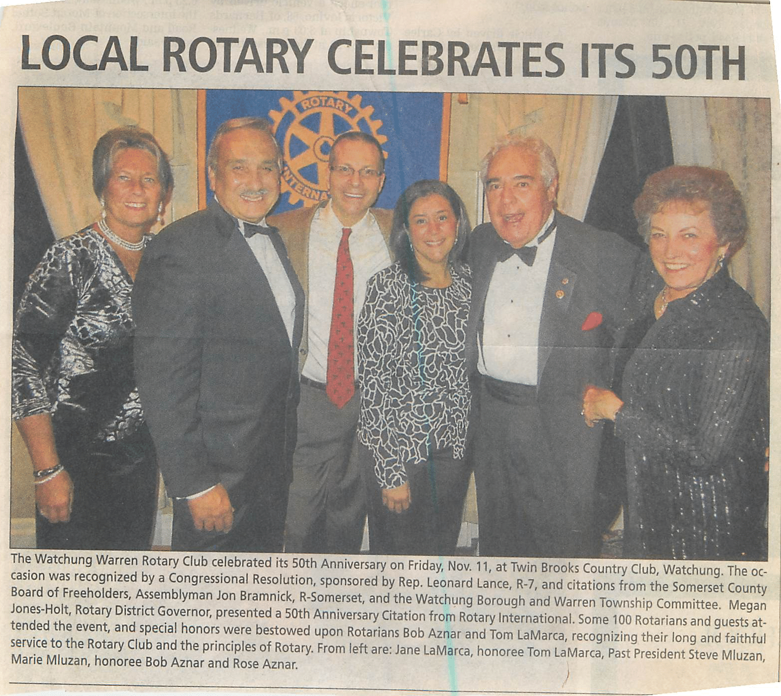 The concept of "Rotary" in the Watchung-Warren area began in June of 1961 when a group of local businessmen gathered to discuss establishing a service club in the area. Following the On November 10, 1961, the then-provisional Watchung Rotary club was born with 22 original chartered members. Among the founding members were Lewis Gray of Gray's Florist, George Mauro, then General Manager of the historic Washington House, and Frank Weldon of Weldon Quarry. The original club met every Tuesday at the historic Washington House Inn until it burned down in 1962. After 11 years of service, the Watchung Rotary Club expanded to include Warren, thus forming the Watchung Rotary Club we know today. In 2021, the Watchung Warren Rotary Club will be celebrating its 60th anniversary.